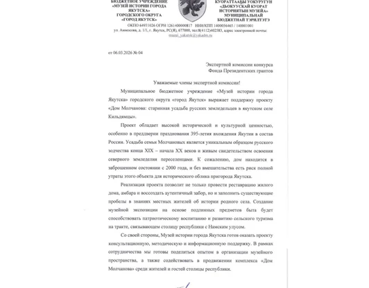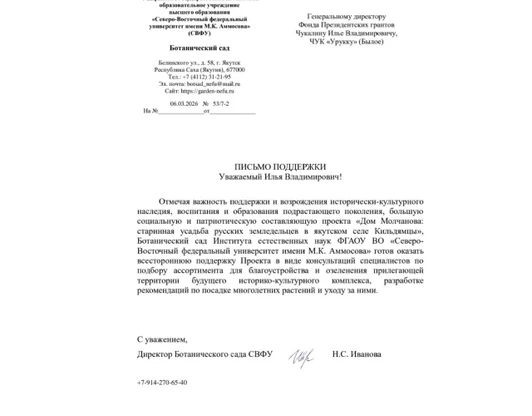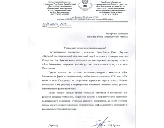 ПАРТНЕРСКАЯ ПОДДЕРЖКАПроекта "Дом Молчанова: старинная усадьба русских земледельцев в якутском селе Молчанова"Музей им.ЯрославскогоМузей истории г.ЯкутскаБотанический сад СВФУ